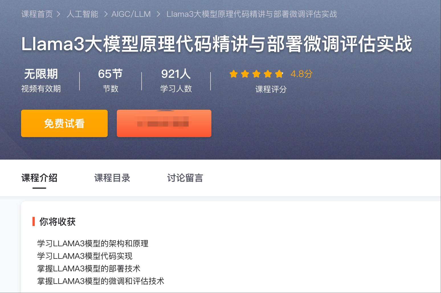 这是一门内容全面、理论实践并重的大模型课程。不仅系统讲解了LLM和Llama 3的技术原理, 还通过代码解析和实战项目深度剖析了相关技术在工程落地中的关键环节, 有助于学员全面掌握大模型相关知识和动手实战能力。